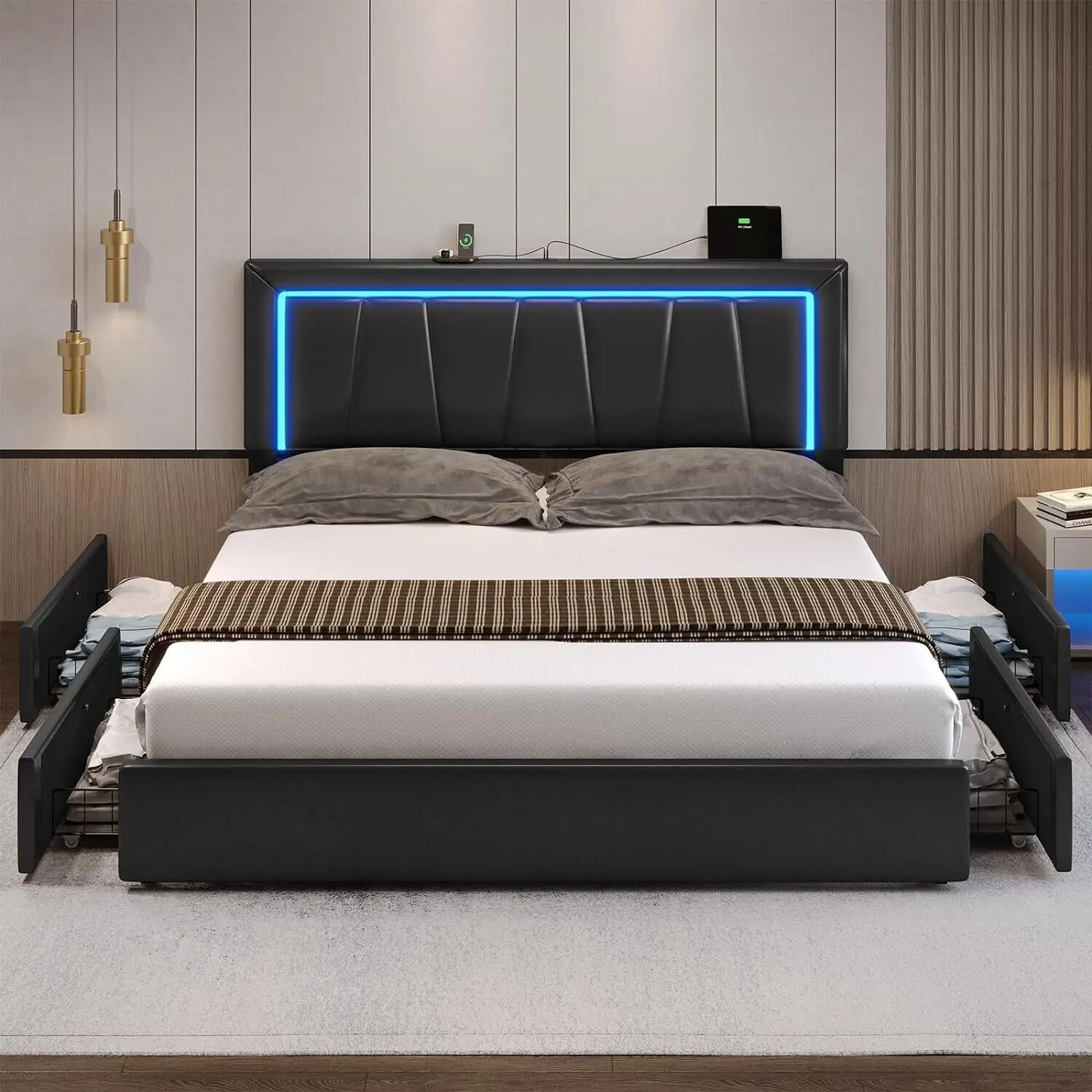 Special Feature: No Box Spring Needed, With LED Lights Adjustable Headboard, With Type-c and USB Ports, Squeak Resistant, With 4 Storage Drawers